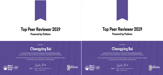 近期,科睿唯安(Clarivate Analytics, Web of Science Group)旗下学术研究事业部Publons公布了2019年度“全球同行评议奖”的获奖者名单。我院复合材料研究所白成英老师同时在交叉学科领域 (Cross-field)、工程学(Engineering)两个学科中荣获全球同行评议专家奖(Top 1% in each field)。