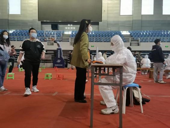 经过了前期忙碌的筹备,场地布置,中午12点,全员核酸检测正式开始。为加快核酸检测的速度,学生志愿者们积极认真帮助同学、老师以及学校工作人员进行核酸检测的组织协助工作,有序引导人员进场和离场。