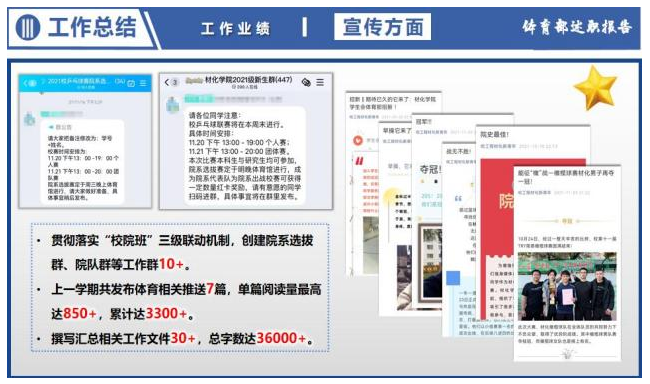 大三学年从学风部门转到文体部门,担任学院学生会体育部部长。尽管工作内容有些陌生,但这并未影响我“既然要做就要做好”的想法。从宣传活动、“招兵买马”到组织训练、备战比赛,再到齐心协力、为院出征,我总是以夺冠为目标,统筹安排,尽心尽力,到场每一次训练,观战每一场比赛。在副部、部员的通力合作下,获新生篮球赛冠军、橄榄球赛冠军、引体向上达人赛冠军等6项学院最佳战绩。此外,我书写文件超万字,整理文档20余个,在学生会评比文体部分拿到满分,助力学院再获“优秀学生会”荣誉称号。