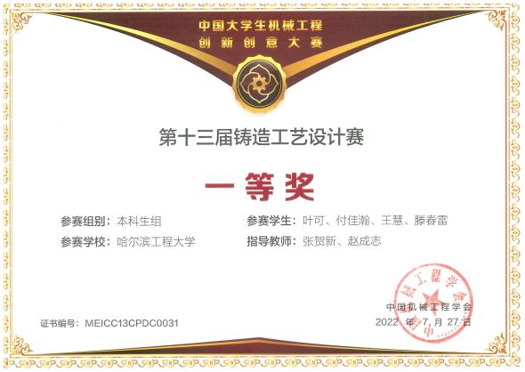 铸造大赛获奖证书