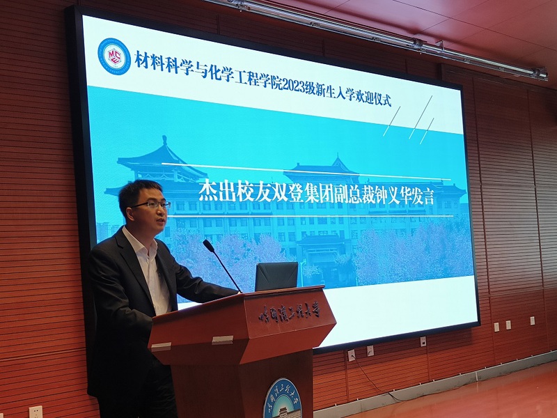 学院2000级校友、双登集团股份有限公司副总裁钟义华受邀发言。他首先表达了对母校栽培之情的由衷感谢,并介绍了他所在的双登集团股份有限公司。公司是国内从事蓄电池和新能源产品研发、生产、销售的国家重点高新技术企业,现有30多位哈工程校友,七成以上校友都已成长为集团骨干和技术精英。值此学校70华诞之际,双登集团股份有限公司向学校捐赠50万元,专门用于奖励支持材化学院的优秀学子,主要设立专项奖学金和创新创业项目支持。钟义华希望同学们不要辜负学校和学院的栽培,要努力学习,提升自己,不负青春年华。同时,他也诚邀更多的哈工程学子加入双登大家庭一同工作,共同成长。