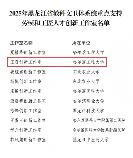 近日,黑龙江省教科文卫体工会发布《关于公布2025年重点支持的劳模和工匠人才创新工作室名单的通知》(黑教科文卫体工发〔2025〕23号),学院王君教授领衔的创新工作室成功入选,成为本年度全省教科文卫体工会重点支持的十个工作室之一。